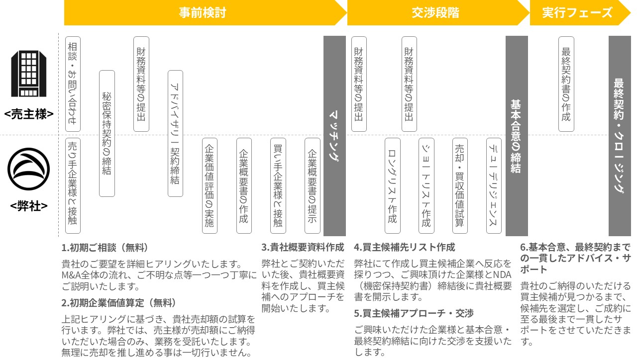 秘密保持契約の範囲内とはなりますが、オーナー様からご相談いただいた際に、M&Aがイメージしやすいようにご説明いたします。